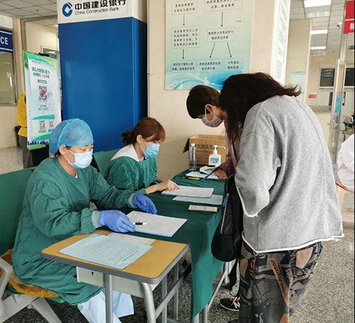 在此基础上,加强医院入口管控和服务。医院组织机关、工勤和病房医护人员组成志愿者严把医院各出入口,有效控制入院人员数量。随着疫情形势的不断变化,医院入口安检方式方法也在不断调整,目前医院分别设立了“门诊患者、急诊患者、住院患者及陪护人员、本院员工、急诊检查”五个分类通道,均有志愿者负责体温检测、行程码查验及流行病学表填写,分类层层把关,保障了不同人群在院内的合理流动。